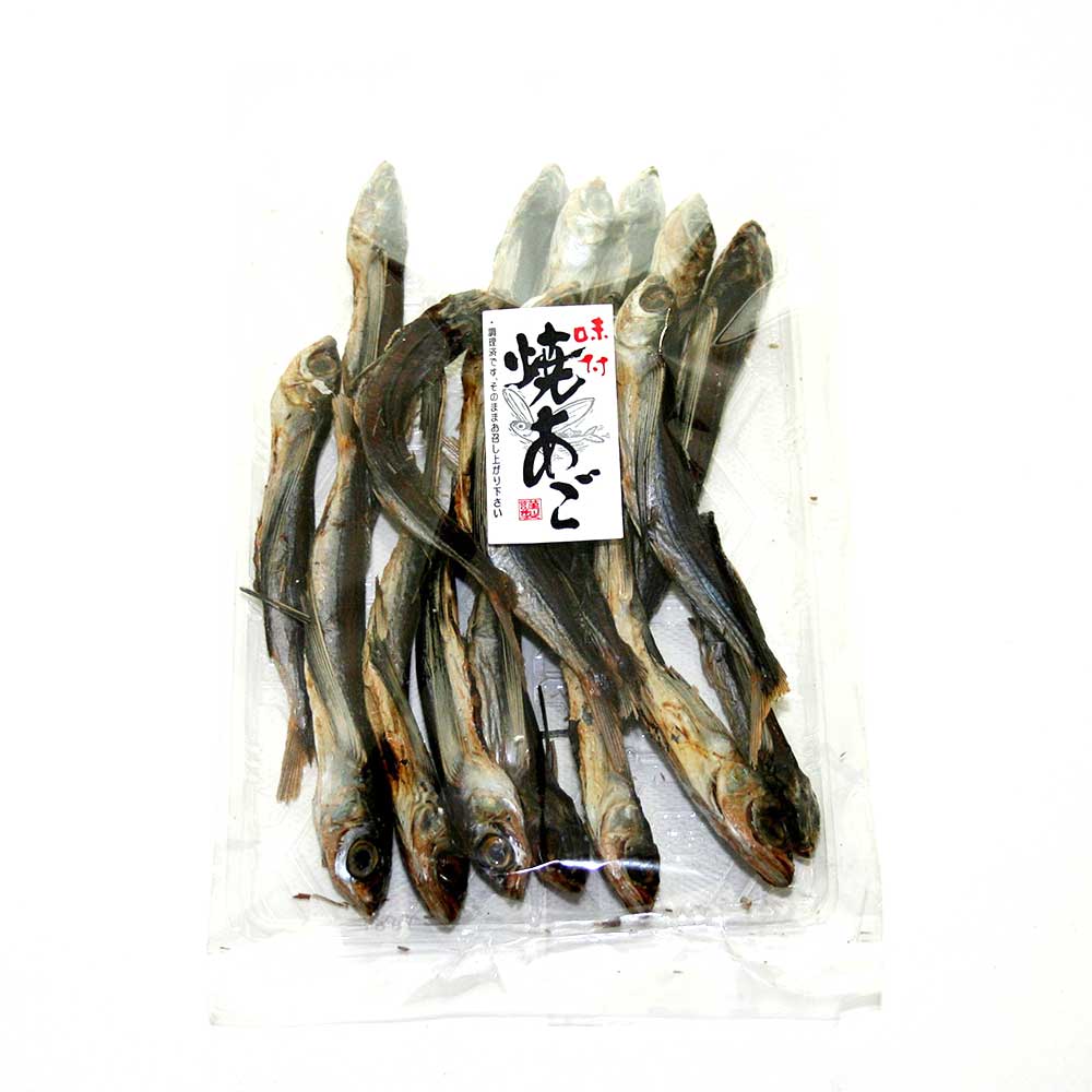 長崎の方はご存知とは思いますが、あごとはトビウオのことなのです。通常、煮干などと同様に”うどん”や”お雑煮”などダシをとるのに使用されることが多いのですが、ここでは長崎県平戸の海で取れたトビウオに味醂の味付け+焼きを加えた”味付焼きあご”を皆さま にご紹介します。